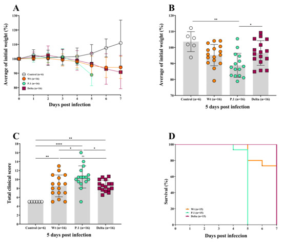 The animals became clearly lethargic, presenting breathing issues, with eyes slightly closed. The total clinical scores obtained for the Delta variant and Wt strain were similar, as no statistical variations were observed.
