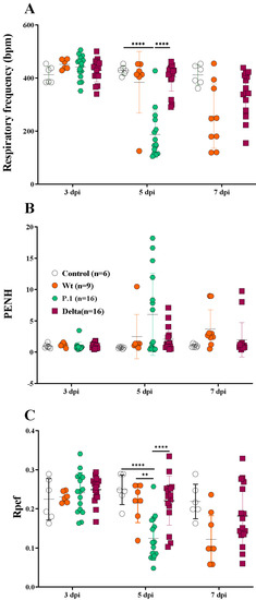 Pulmonary physiological measurements were performed in non-infected or infected animals using an unrestrained chambered whole-body plethysmograph with measurements of the static lung volume, respiratory frequency (RF), enhance pause (Penh), and exhalatory flow curve (Rpef) [40,41]. On the 3rd dpi, no differences in any parameters were noted across all experimental groups (Figure 2A,C). A substantial decline in RF, however, was observed in the P.1-infected mice on the 5th dpi when compared to the control group (p < 0.0001) or Delta-infected mice (p < 0.0001).