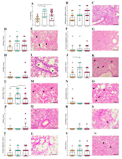 A fragment of the tissue was fixed in neutral buffered 10% formalin for histopathological analysis. For dehydration, after 24 h, samples were washed with 70% ethanol, and following fixation, they were processed for paraffin embedding to form a solid block. Subsequently, the blocks were cut into 5-µm-thick sections and stained with hematoxylin and eosin (H&E). Histological scores from 0 to 4 for edema, hemorrhage, inflammatory infiltrates, congestion, hemosiderin, fibrin, alveolar emphysema, thickness, atelectasis, vasculitis, diapedesis, necrosis/consolidation, reactive alveolar macrophages, pneumonia, and thrombosis were included in the analysis, where 0 = no alteration, 1 = slight alteration, 2 = moderate, 3 = important, 4 = severe alteration. The severity of the disease was the sum of histopathological lesion scores.