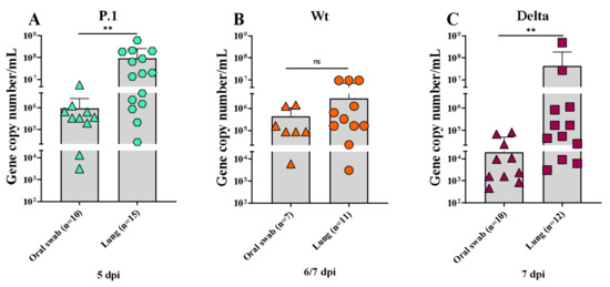 Quantitative detection and viral load analysis in oral swabs and lungs of K18-hACE2 mice. (A) Viral load detection by RT-qPCR in oral swabs and lungs of K18-hACE2 mice infected with P.1 variant (A), Wt strain (B), and Delta variant (C) on the day of death (timepoint or endpoint). Test performed by Mann–Whittney test using GraphPad Prism 8.0, considering p < 0.05 as significant (** p ≤ 0.005).