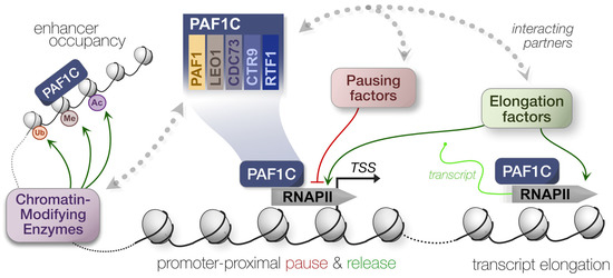 PAF1C has been classically viewed as a positive regulator of gene expression, wherein its occupancy at a TSS creates a transcriptional environment conducive to RNAPII release and productive transcription elongation [4,13,14,15,16]. Mechanistically, the SPT6 recruitment of PAF1C likely displaces negative elongation factor (NELF) to mediate RNAPII release and then maintain transcript elongation [17]. However, this model has become more complex in the last decade, with the discovery that RNAPII release is negatively regulated by PAF1C for highly paused genes [10,18,19]. This could be attributed to upstream super-enhancers, where PAF1C occupation potentially blocks RNAPII function, driving the negative regulation of gene expression [18]. Additionally, PAF1C may recruit transcriptional repressors, such as Integrator-PP2A (INTAC) [20] and NELF/SPT5 [21], with a growing number of studies detecting PAF1C-mediated negative regulation [22,23,24,25]. Of course, these distinct mechanisms for transcription are not mutually exclusive, and others have attributed this difference to the modulation of RNAPII velocity and processivity instead of direct suppression [26]. Various molecular switches may also exist to actively reconfigure PAF1C from a transcription attenuator to an elongation factor [27]. Ultimately, the model remains fluid, yet PAF1C remains a key player in modulating gene expression as an RNAPII scaffold.