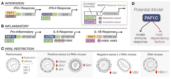 Since the innate immune recognition of viral infections often culminates in an antiviral gene expression program [36], in this review, we will discuss how PAF1C is inherently involved in this process. PAF1C can effectively mount an antiviral response by modulating both interferon and inflammatory gene expression, restricting several distinct virus families. Of course, viruses are notorious for their ability to hinder or hijack host proteins, including the disruption of antiviral signaling [37,38,39]. As methods to identify virus–host interactions are more accessible and widespread [40], we often find that PAF1C is both the archer and the prey when it comes to viruses and innate immunity.
