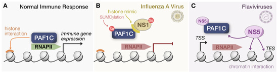 Influenza and Flaviviruses target PAF1C for displacement. (A) Under normal conditions, PAF1C relies on chromatin interactions via histones to associate with RNAPII and recruit additional factors for immune gene expression. (B) During IAV infection, NS1 translocates to the nucleus. Relying on a histone mimic tail, NS1 can displace PAF1C from RNAPII by competitively binding the complex. Additionally, global SUMOylation increased during IAV infection, and NS1 relies on SUMOylation for functionality during virus replication. (C) Flavivirus NS5 localizes to the nucleus and relies on its MTase domain to interact with chromatin. Such an interaction effectively displaces PAF1C from RNAPII during transcript elongation, causing the premature termination of transcription.
