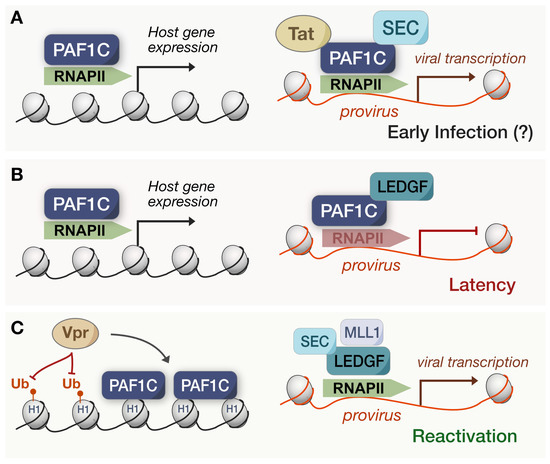 Tat may contribute to PAF1C displacement in this way, yet other HIV proteins are implicated as well. Recent work found that Vpr expression reduced histone H1.2 ubiquitination, and when H1.2 was affinity purified, proteomics showed Vpr expression enhanced PAF1C binding to H1.2 [69] (Figure 4C). Histone H1 can be integral to chromatin accessibility and the resulting differential gene expression, so Vpr may indirectly antagonize PAF1C via this process to sequester its antiviral functions. Either way, future studies should focus on whether Vpr and Tat are targeting the immune or proviral transcription roles in which PAF1C is involved. It also begs the question as to whether PAF1C displacement and viral activation is a byproduct of host functions over time or a process initiated by the virus during latency. Our convoluted model exemplifies how the relationship between PAF1C and viruses is highly complex, and the functional trade-offs may create a delicate balance between viral hijacking and host restriction.