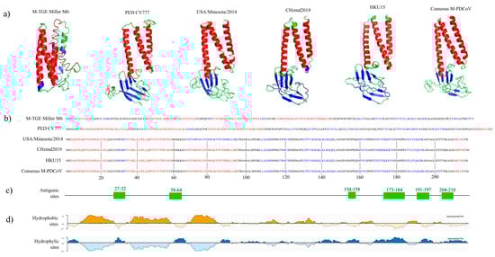 - Rodriguez-Enriquez, A.; Herrera-Camacho, I.; Millán-Pérez-Peña, L.; Reyes-Leyva, J.; Santos-López, G.; Rivera-Benítez, J.F.; Rosas-Murrieta, N.H. Predicted 3D model of the M protein of Porcine Epidemic Diarrhea Virus and analysis of its immunogenic potential. PLoS ONE 2022, 17, e0263582. [Google Scholar] [CrossRef] [PubMed]