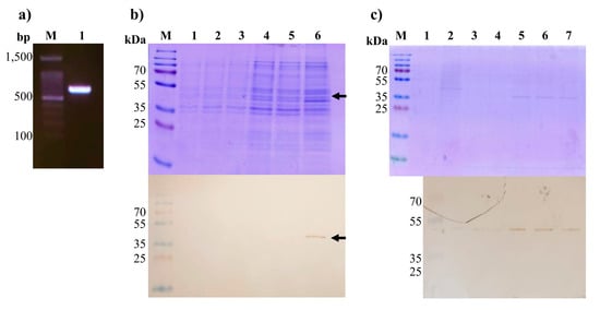 rM-PDCoV expression. (a) Integrity and weight verification (654 bp) of the PDCoV-M synthetic gene. (b) Western blot and SDS-PAGE to verify the rM-PDCoV expression. Lines 1 to 3 are samples of the culture media before the E. coli BL21 (DE3) disruption. Line 4 is a sample after the E. coli BL21 (DE3) disruption. Lines 5 and 6 are samples after centrifuging of the cultures, soluble and insoluble phases, respectively. The rM-PDCoV was found in the insoluble phase as inclusion bodies. (c) The rM-PDCoV confirmation after purification with Ni-NTA agarose column with His-tag affinity. Purified recombinant proteins were observed from elutions 5 to 7. The rM-PDCoV is 37.7 kDa of the expected molecular weight.