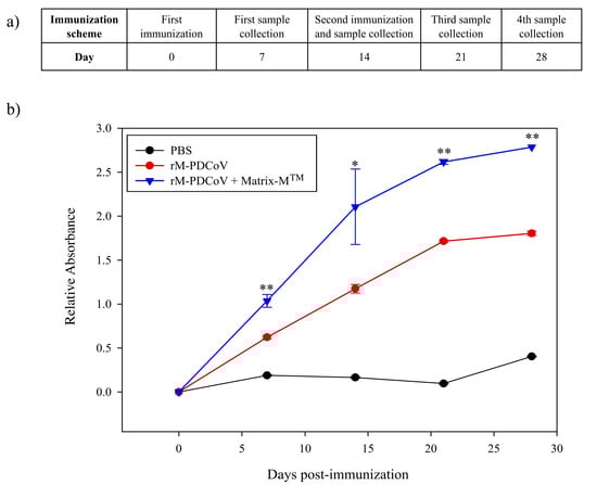 The rM-PDCoV was used to immunize mice according to a specific inoculation scheme (Figure 4a). After the first dose of immunization, we observed an increased level of antibody production in the rM-PDCoV- Matrix-MTM group (red line) and rM-PDCoV group (blue line), with a statistical significance of p < 0.05 (**), respectively. After the second immunization, the antibody production was dramatically higher in both groups, with a statistical significance of p < 0.05 (**). Antibody production was maintained until day 28 (Figure 4b). The black line indicates a group of mice immunized only with a PBS buffer.