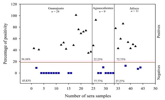 Positive samples were selected based on the cut-off value, which corresponds to an absorbance of 0.3732 ± 3 SD and 14.3137% PP (see Materials and Methods). Then, 44 sera samples from three Mexican states, Guanajuato (n = 24), Aguascalientes (n = 9) and Jalisco (n = 11), located in “El Bajío”, were analyzed by an iELISA assay and the highest absorbance was considered as having 100% PP, which corresponds to an absorbance of 2.3993. A total of 23 positives and 21 negatives sera were observed (Figure 5). From theses, 13 positives (54.16%) and 11 negatives (45.83%) were observed in Guanajuato. In Aguascalientes, two positives (22.23%) and seven negatives (77.77%) were observed. Lastly, eight positives (72.73%) and three negatives (27.27%) were observed in Jalisco. Moreover, it is important to highlight that the 23 positive samples were negative in an iELISA evaluation for NTD-S recombinant protein of PEDV and, in turn, the 21 negative samples were positive to NTD-S recombinant protein of PEDV.