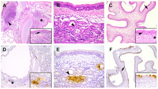 Histopathological features and viral nucleoprotein expression. upper row (A–C) hematoxylin and eosin stain (HE); bottom row (D-F) SARS-CoV-2 N-protein expression with immunohistochemistry (IHC); (A) lung, bronchus (days post-inoculation (DPI) 7), multifocal inflammatory cells in and around submucosal glands (asterisk) with degeneration of lining bronchial-epithelial cells (arrow, insert) and presence bronchiolar alveolar lymphoid tissue (BALT) (arrowhead); objective 10×; (B) trachea (DPI 4), presence of mononuclear inflammatory cells and lesser neutrophils in and around submucosal gland with epithelial degeneration (arrowhead), objective 40×; (C) nose DPI 7), submucosa is infiltrated with inflammatory cells (neutrophils and lesser macrophages and lymphocytes, arrow) objective 5×, insert: respiratory epithelial lining is infiltrated with inflammatory cells (arrowhead) and inflammatory cells in submucosa (asterisk); (D) lung, bronchus (DPI 7) viral antigen expression in epithelial cells of submucosal glands (asterisk), objective 10×, insert location asterisk; (E) trachea (DPI 4); viral antigen expression in epithelial cells of submucosal glands (arrowhead), objective 40×; (F) nasal conchae (DPI 7) viral antigen expression in nasal respiratory epithelial cells (arrow), objective 5×, insert location arrow; all inserts were made with objective 40×.