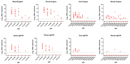 E-gene and subgenomic PCR results on swabs. For E-gene PCR (upper panel) and subgenomic (sg) PCR (lower panel), the log10 RNA copies/mL are shown. All samples for uninfected control animals were negative and these were not included; dotted line indicates PCR detection limit.