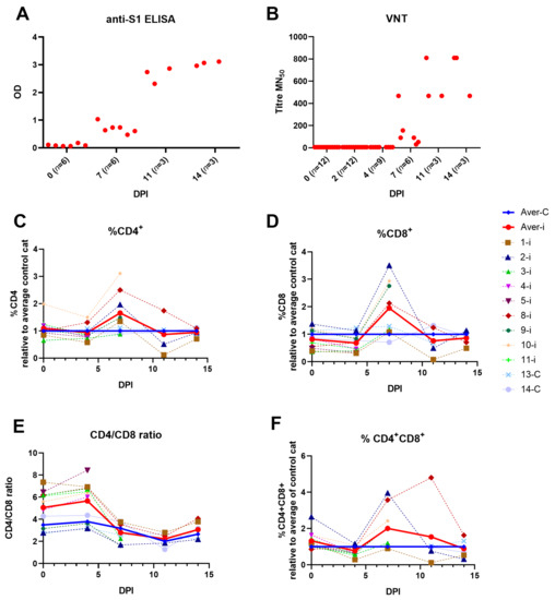 Humoral and cellular immune response after SARS-CoV-2 infection. (A) Anti-S1 antibody response measured by ELISA at OD450. (B) Neutralizing antibody titers expressed as 50% neutralization titer (MN50). (C–F) Whole blood was analyzed by flow cytometry for % of CD4+, CD8+, CD4+CD8+ cell and CD4/CD8 ratio on DPI 0, 4, 7, 11 and 14. The percentage (%) of the different subsets of the infected animals are shown as relative expression to average of control animals (13 and 14); (C–F) Infected animals euthanized on DPI 2 were not included. Average = Aver, infected = i, control = C. The number of infected animals decreased from DPI 7 due to euthanasia: DPI 0 (n = 9), DPI 4 (n = 9), DPI 7 (n = 6), DPI 11 and 14 (n = 3).