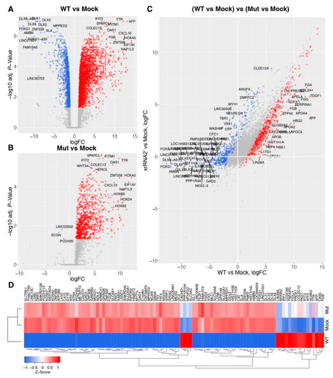 Differential host gene expression in iPSC-derived human brain organoids infected with WT and sfRNA-deficient ZIKV. Human brain organoids at DIV15 were infected with WT or sfRNA-deficient ZIKV mutant at a dose of 105 FFU. Total RNA was isolated at 3 dpi and analyzed by RNA-Seq. (A) Volcano plot showing differentially expressed genes in human brain organoids infected with WT ZIKV. (B) Volcano plot showing differentially expressed genes in human brain organoids infected with sfRNA-deficient ZIKV mutant. In (A,B) genes with significantly different expression levels compared to the mock (FDR-corrected p-value < 0.05 and logFC > 1 or <−1) are shown in the color red for upregulated genes and blue for downregulated genes. The top most significant differentially expressed genes (DEGs) are labeled. (C) Comparison of gene expression levels between human brain organoids infected with WT and sfRNA-deficient (Mut) ZIKV. Genes with significantly different expressions (FDR-corrected p-value < 0.05 and logFC > 1 or <−1) are shown in the color red for genes with higher expression in WT infection compared to Mut virus infection and blue for genes with lower expression in WT infection compared to Mut virus infection. (D) Heat map representation of the expression levels of the top 100 most significant genes identified in (C).