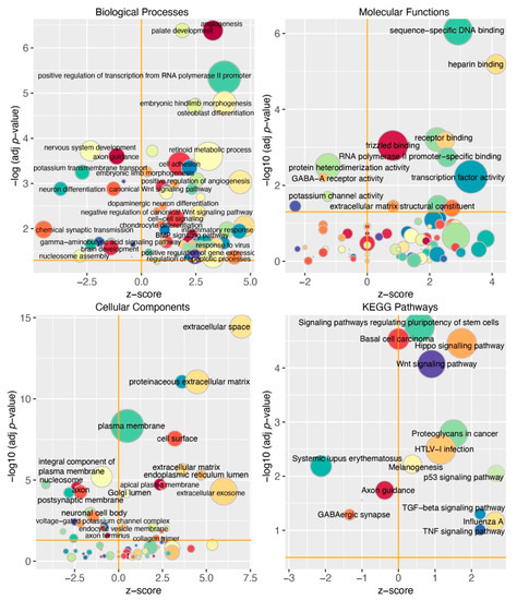 Functional classification of differentially expressed host genes that responded differently to infection with WT compared to sfRNA-deficient ZIKV in iPSC-derived human brain organoids. Size of bubbles on the plots is proportional to the number of associated genes; significantly enriched categories are labeled.