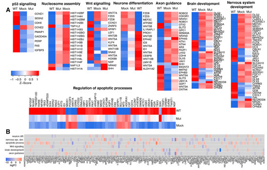 Expression of the host genes associated with brain development and antiviral response in iPSC-derived human brain organoids infected with WT and sfRNA-deficient ZIKV. (A) Expression of host genes associated with biological processes and signaling pathways differentially affected by WT and sfRNA-deficient ZIKV. (B) Heat map showing association with multiple biological processes of individual differentially expressed host genes.