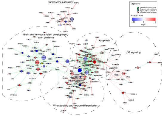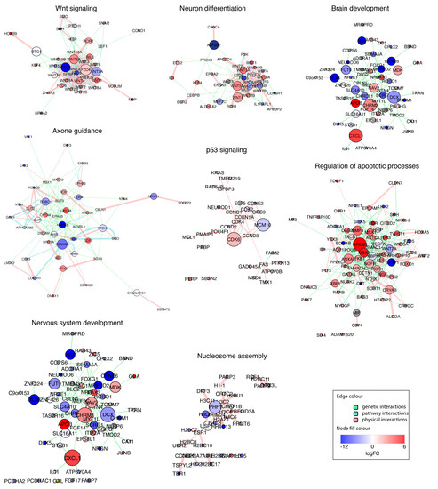 Network reconstruction. Gene interaction networks were reconstructed using Cytoscape v3.8.0. Individual networks were generated from DEGs associated with GO categories related to brain development and apoptosis using a local search with the GeneMANIA Cytoscape Plug-in. Interaction types considered in the network were “pathways”, “genetic interactions”, and “physical interactions”. The networks were then merged using the “merge networks” function of Cytoscape, with the mode set to “Union” and the nod keys set to “gene name”. Betweenness centrality values were calculated using the “Analyze Network” function of Cytoscape and represent the numbers of the shortest paths that pass through each nod in the network. A table of gene names with logFC values was then merged with the table of nods where logFCs were displayed as nod coloring.