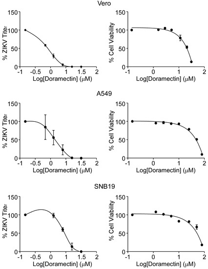 Antiviral activity and cytotoxicity spectrum of doramectin in Vero, A549, and SNB19 cells. ZIKV titer was quantified by plaque reduction assay and cell viability was detected by MTT assay.