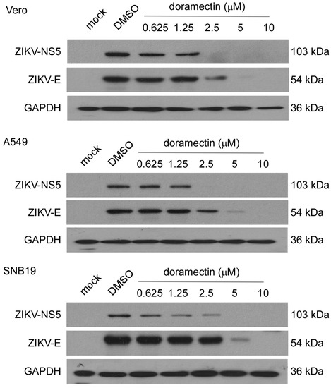 Doramectin inhibits the expression of ZIKV proteins. Western blotting analysis of protein expression of ZIKV NS5 and E in the cell lysates of Vero, A549, and SNB19 for the anti-ZIKV activity of doramectin or DMSO at indicated concentrations at 48 h post-infection (hpi) (MOI = 0.2).