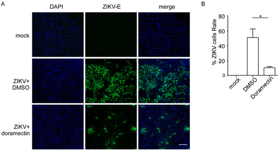 Doramectin prevents cells from ZIKV infection. (A) Immunofluorescence staining for ZIKV-E in ZIKV-infected A549 cells (MOI = 2) under the treatment by DMSO or 2.5 μM doramectin. Cell nuclei were stained with DAPI (blue). ZIKV-E protein was indicated in green (Scale bar, 100 μm). (B) Quantification of the number of ZIKV+ cells relative to mock infection is shown in the histogram. * p < 0.05.