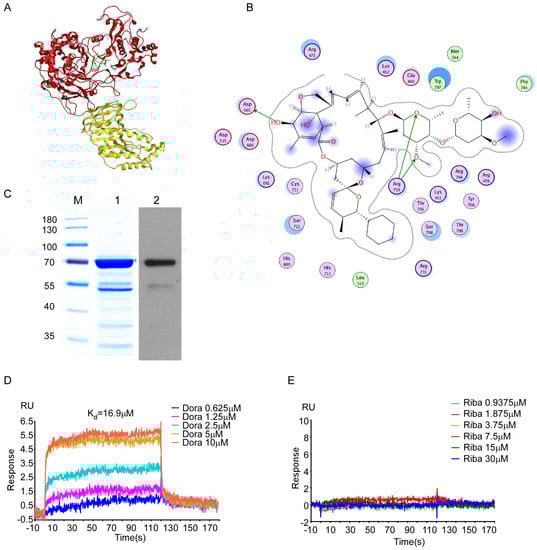 Doramectin directly binds to ZIKV RdRp. (A) Structural model for doramectin binding to the ZIKV NS5 protein was performed with Molecular Operating Environment (MOE). The NS5 protein is displayed as ribbons with the RdRp domain in red, MTase domain in yellow, and doramectin shown as green sticks. (B) Two-dimensional ligand-interaction maps of co-crystals of ZIKV NS5 domains bound with doramectin were generated using MOE. Polar residues are colored light purple, charged residues have an additional blue ring, and lipophilic residues are green. The degree of solvent exposure is shown by the blue halos. H-bond interactions to the amino acid side chain or main chain are shown as dashed green arrows, pointing toward the H-bond acceptor. (C) Coomassie blue-stained SDS-PAGE (lane 1) of crude extracts and western blot probed with anti-ZIKV NS5 (lane 2) after purification. (D,E) The surface plasmon resonance biosensor (SPR) assay to examine and characterize the binding of doramectin (D) or ribavirinc (E) to ZIKV RdRp. The Kd values were calculated via the BIAcore T100 analysis software (BIAevaluation Version 3.1).