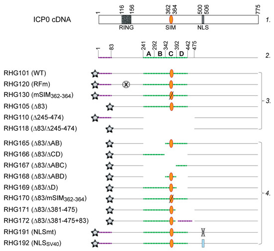 Schematic diagram of ICP0 structure of the recombinant viruses used in this study. Line 1: ICP0 cDNA with the illustration of RING-type E3 domain, SIM362–364 and nuclear localization sequence (NLS). Line 2: Bipartite PML I-interaction domain, with left arm labeled by purple dashed line and right arm by green dashed line. The right arm is divided into segments A–D with their residue numbers labeled on top. Group 3: Previously published recombinant viruses. Group 4: recombinant viruses constructed in this study. The gray star represents the mCherry tag fused to the N-terminus of all ICP0 constructs; the orange oval represents ICP0 SIM362–364, with a slash across the oval representing mutated SIM362–364; the crossed-out circle represents the mutated RING and the crossed-out rectangle represents the mutated NLS; the blue rectangle represents the NLS of SV40; and the absence of a line represents a deletion in the ICP0 sequence.