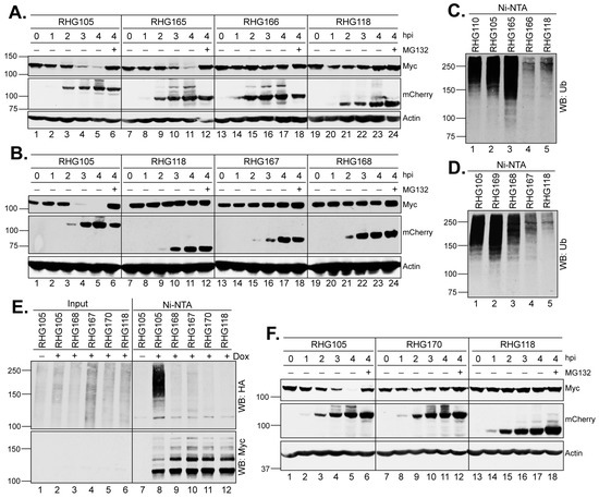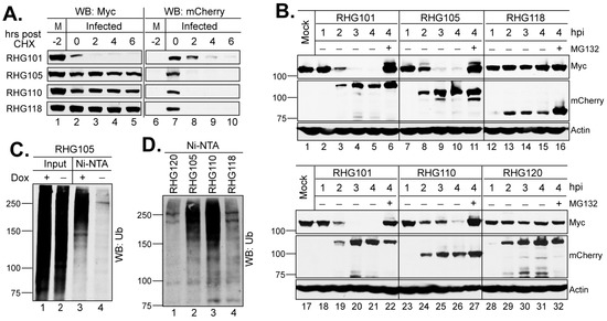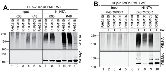 HEp2-TetOn cells expressing HisMycPML I were mock induced or induced with 1 μg/mL Dox for 24 h, with or without the transfection of plasmids that contain either wild type or mutant ubiquitin tagged with HA in the N-terminus. The cells were then exposed to 5 pfu/cell of a recombinant virus. At 3 h post infection (hpi), cells were harvested, washed, and lysed in a UREA-lysis buffer (8 M urea, 100 mM Na2HPO4/NaH2PO4 [pH 8.0], 10 mM Tris-HCl [pH 8.0], 5 mM imidazole, 50 µM deubiquitinase inhibitor PR619 (Selleckchem, Houston, TX, USA)). Then the cell lysates were subject to brief sonication before spinning down at 14,000 rpm for 5 min. The supernatant was incubated with Ni-NTA agarose beads (Qiagen) for 3 h at room temperature with gentle agitation. The beads were then washed four times, with the UREA-lysis buffer, a UREA-wash buffer (8 M urea, 100 mM Na2HPO4/NaH2PO4, 10mM Tris-HCl [pH 6.8], 5 mM imidazole, 10 mM β-mercaptoethonal), a UREA-wash buffer containing 0.1% Triton X-100, and PBS, respectively, for 5 min each. The HisMyc PML I protein was then eluted with an elution buffer (0.2 M imidazole, 0.15 M Tris-HCl [pH 6.8], 30% Glycerol, 0.72M β-mercaptoethonal, 5% SDS). The eluates were electrophoretically separated by 7% SDS-PAGE and probed with anti-ubiquitin or anti-HA antibody by Western blotting.