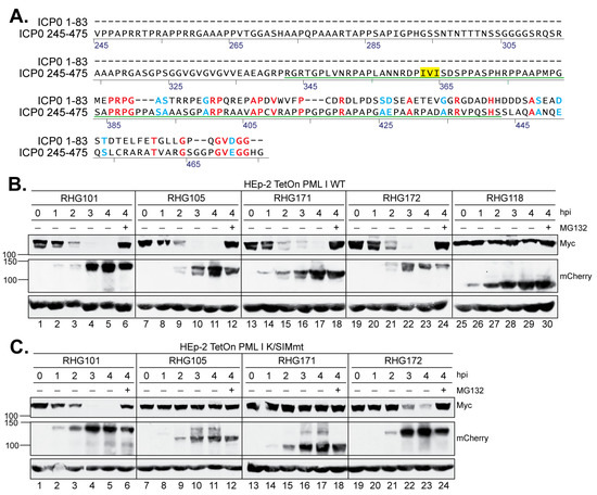 To study the HSV-1 elements that regulate the E3 ubiquitin ligase activity of ICP0, we manipulate HSV-1 genes and then measure the half-life of an ICP0 substrate during the infection [36,37]. Using a substrate half-life assay, we have reported that SIM362–364 is required for the proteasomal degradation of PML isoforms II, IV and VI, but not for PML I [36], and characterized the regulatory effects of SUMO-interaction on ICP0 E3 by using PML II as a model substrate [37]. For the SIM362–364-independent PML I degradation, we previously reported that two regions of ICP0, the N-terminal residues 1–83 and central residues 245–474 that flank the RING finger, namely the left and right arms of a bipartite PML I-interaction domain, redundantly interact with PML isoform I. Deletion of either region did not block ICP0 from interacting with PML I, whereas deletion of both regions completely abolished the interaction [36].