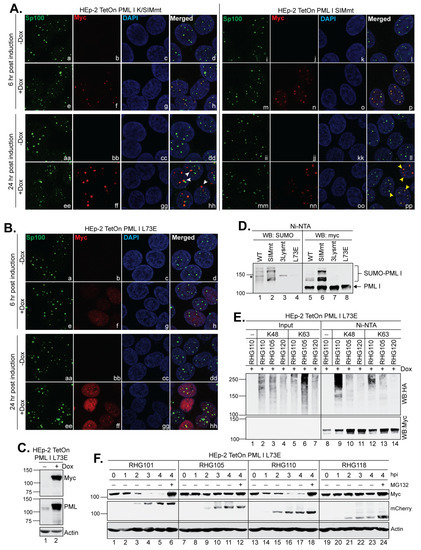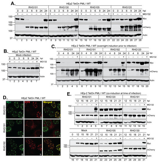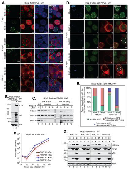HEp-2 TetOn cells were cultured in DMEM medium (Invitrogen, Waltham, MA, USA) supplemented with 10% FBS and 6 μg/mL blasticidin (Invitrogen). HEp-2 TetOn cells stably expressing PML I were cultured in DMEM supplemented with 10% FBS, 6 μg/mL blasticidin and 100 μg/mL zeocin (Invitrogen), as previously described [36]. Recombinant viruses RHG101, RHG105, RHG110, RHG118, RHG120, and RHG130 have been described elsewhere [22,38].