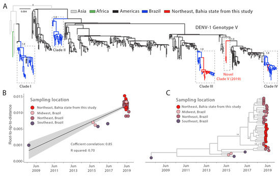 Genomic monitoring of DENV-1 genotype V in Bahia state, northeast Brazil. (A) Maximum likelihood (ML) phylogenetic analysis of 17 complete genome sequences from DENV-1 generated in this study plus n = 487 available sequences from GenBank. The scale bar is in units of nucleotide substitutions per site (s/s) and the tree is mid-point rooted. Colors represent different sampling locations. (B) Regression analysis of the root-to-tip divergence against the sampling date for the DENV-1 genotype V dataset using the statistical approach implemented in TempEst [25]. (C) Time-scaled maximum clade credibility phylogeny of Dengue-1 genotype V (DENV-1V) clade of two genomes isolated in Bahia state, northeast Brazil, plus the fourteen new genomes generated in this study and (n = 28) Brazilian reference strains from the distinct region. Tips are colored according to the Brazilian region. Values around key nodes represent posterior probability support.