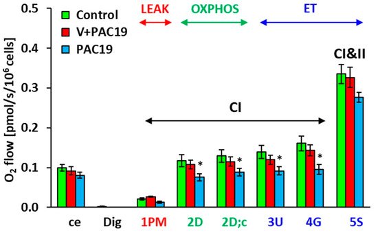 Platelet mitochondrial respiration in vaccinated and unvaccinated patients with post-acute COVID-19 (V + PAC19, PAC19) was evaluated as O2 flow [pmol/s/106 cells]. Legends: The parameters are named according to the titration steps in the SUIT protocol and represent respiration after the corresponding titration step: ce—intact cells (platelets); Dig—digitonin; 1 PM—pyruvate plus malate; 2D—adenosine diphosphate (ADP); 2D; c—cytochrome c; 3U—uncoupler FCCP; 4G—glutamate; 5S—succinate. The bars show mean ± sem. LEAK—non-phosphorylating resting state of respiration; OXPHOS—the phosphorylating state of respiration associated with ATP production; ET—noncoupled state of respiration at an optimum concentration of uncoupler. CI—complex I pathway; CI and II—complex I and complex II pathway. Control—control group (n = 16); V + PAC19—vaccinated patients with post-acute COVID-19 (n = 10); PAC19—unvaccinated patients with post-acute COVID-19 (n = 10); * p < 0.05—statistical significance vs. control group.