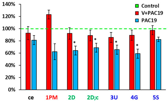 Differences of platelet mitochondrial bioenergetics in % between control group, vaccinated (V + PAC19) and unvaccinated patients (PAC19) with post-acute COVID-19. Legends: see Figure 1, * p < 0.05—statistical significance vs. control group.
