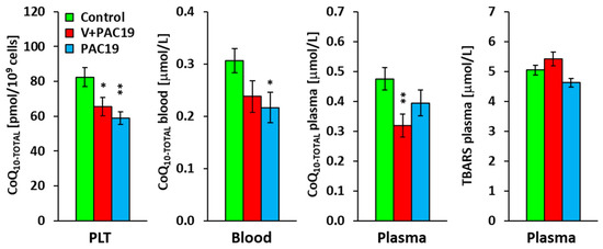 The concentration of CoQ10-TOTAL in platelets, blood, plasma, and TBARS in vaccinated and unvaccinated patients with post-acute COVID-19 (V + PAC19, PAC19). Legends: Control—control group; V + PAC19—vaccinated patients with post-acute COVID-19; PAC19—unvaccinated patients with post-acute COVID-19; CoQ10-TOTAL (ubiquinol + ubiquinone); PLT—platelets; TBARS—thiobarbituric acid reactive substances; The bars show mean ± sem. * p < 0.05, ** p < 0.01—statistical significance vs. control group.