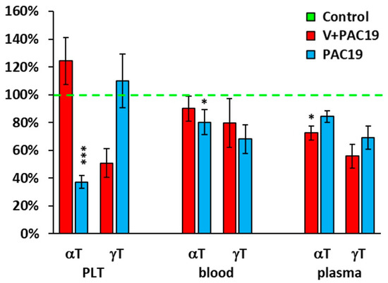 Endogenous α- and γ-tocopherols levels in platelets, whole blood, and plasma in vaccinated and unvaccinated patients with post-acute COVID-19 as % of control group values. Legends: Control—control group; V + PAC19—vaccinated patients with post-acute COVID-19; PAC19—unvaccinated patients with post-acute COVID-19; PLT—platelets, αT—α-tocopherol, γT—γ-tocopherol. Results are expressed in percentages, and control group values are taken as 100%. * p < 0.05, *** p < 0.001—statistical significance vs. control group.