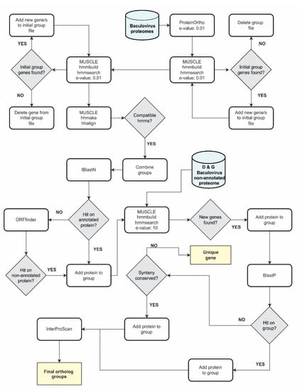 However, some genomic files may lack annotated putative genes, and so, the longest sequence was selected from each group of homologues and used as query in a tblastn on the excluded genomes. If a hit was detected in an annotated open reading frame (ORF), the corresponding protein was added to the orthologous group. If the hit was located in an unannotated region, the ORFFinder server was used to predict the longest ORF that included it, the novel protein was obtained by in silico translation and was then added to the corresponding homology groups, with the MSAs and HMMs repeated. In addition, a new expanded database was built on delta and gammabaculovirus genomes using ORFFinder, and a search was conducted on it with each of the HMMs. This generated a new batch of results (partial result 6 -RP6-). Furthermore, HMMs were used as probes to search all potential ORFs present in gammabaculoviruses and deltabaculovirus with more relaxed criteria (e-value 10) to generate a new set of results (partial result 7 -RP7-). Finally, those ortholog groups that were integrated by all alpha- and betabaculoviruses and missing all or some of the gammabaculoviruses or deltabaculovirus were analyzed by synteny or previously reported biological function, to generate the final result of the computational algorithm. For each of the partial results, InterProScan [30] was used to confirm correct grouping. Proteins not contained in any of the homologous groups (and not considered as paralogs after analyzing their similarity with established groups of orthologs) were considered derived from unique genes, and the total number of genes (shared and unique) present in Baculoviridae were counted.