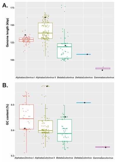 Length and GC content of baculoviral genomes. (A) Box plot of the 297 baculoviral genomes according to their length (ordinate axis) and considering taxa (abscissa axis). (B) Box plot of the 297 baculoviral genomes according to their GC content (ordinate axis) and considering taxa (abscissa axis). Each dot represents the datum for each genome. The value linked to each of the baculovirus prototypes (AcMNPV for Alphabaculovirus Group I; LdMNPV for Alphabaculovirus Group II; CpGV for Betabaculovirus; CuniNPV for Deltabaculovirus; NeleNPV for Gammabaculovirus) is indicated with black circles.