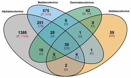Protein-genes in Baculoviridae. The Venn diagram shows the numbers of all putative baculoviral protein-coding genes distributed by genera and indicating which ones are shared among taxa or are unique. The detail of the identity of each gene is shown in Table S2. These results derive from the application of the automated algorithm generated in this work (OBP) to determine ortholog groups and putative unique genes. The numbers in black bold letters represent amounts of shared protein genes. In regions without overlapping ellipses the numbers in black bold letters also include unique genes. It is indicated with numbers in blue letters between parentheses how many of the shared protein genes form groups of orthologs in all viruses considered, and in red letters the amount of putative unique genes per genus. To facilitate the understanding of this figure, examples of interpretation are provided: (a) the genomes of alpha and betabaculoviruses have 251 protein-coding genes (bold black number), each of which is present in at least one alphabaculovirus and one betabaculovirus but not in any members of other genera; 15 (blue number) of these 251 genes have homologs in all the alpha and betabaculovirus genomes analyzed. (b) Alphabaculoviruses possess 1388 (bold black number) protein-coding genes that lack homologs in any other baculoviral genus; of these, 7 (blue number) have homologs in all the alphabaculovirus genomes analyzed and 1148 (red number) are unique to a single genome. This graph does not include paralog protein genes.
