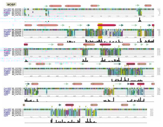 Likewise, a Z-score analysis revealed values comparable to those obtained when studying other accepted core genes in Baculoviridae (Figure S4). Although MOBP presented some Z-score values below zero, Desmoplakin and P6.9 (accepted orthologous proteins) showed similar behavior, especially in the case of CuniNPV Z-scores. In the case of Desmoplakin, 49 alphabaculovirus, 74 betabaculovirus and three gammabaculovirus Z-score values were below zero. For P6.9, 180 alphabaculovirus, 70 betabaculovirus and two gammabaculovirus Z-score values below zero were obtained. However, for MOBP, only two alphabaculovirus, 14 betabaculovirus and one gammabaculovirus Z-score values were below zero. Therefore, by functional homology (i.e., protein that constitutes the paracrystalline matrix of OB) and partial sequential homology, it is appropriate to consider that the “major occlusion body protein” (MOBP) in baculoviruses should be postulated as a product of the 39th core gene. In fact, this would be consistent with a morphological characteristic of the virions of this viral family (occlusion bodies) that is common to all the known members.