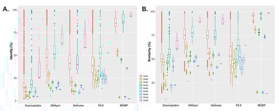 Similarity and identity study for MOBP. Box plots showing Identity (A) and Similarity (B) values for some baculovirus core proteins (Desmoplakin, DNA polymerase, DNA Helicase, P6.9 and the major occlusion body protein -MOBP-) among isolates from different genera. The box plots include outliers and the abbreviations A, B, D and G stand for Alphabaculovirus, Betabaculovirus, Deltabaculovirus and Gammabaculovirus, respectively.