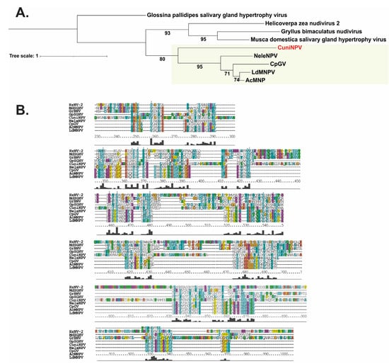 Phylogeny inference based on major occlusion body protein. (A) Phylogram based on the major occlusion body protein (MOBP) of baculovirus prototypes (AcMNPV for Alphabaculovirus Group I; LdMNPV for Alphabaculovirus Group II; CpGV for Betabaculovirus; CuniNPV for Deltabaculovirus; NeleNPV for Gammabaculovirus) and other invertebrate viruses [YP_001111332.1 (Gryllus bimaculatus nudivirus); YP_004956818.1 (Helicoverpa zea nudivirus 2); YP_001687041.1 (Glossina pallidipes salivary gland hypertrophy virus); YP_001883404.1 (Musca domestica salivary gland hypertrophy virus)]. The colored region contains the main taxa of Baculoviridae. CuniNPV (CUN085) is indicated in red letters. Bootstrap values are indicated. (B) Some relevant parts of the multiple sequence alignment used for the MOBP phylogenetic analysis.
