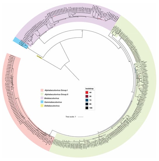 Baculovirus phylogeny. Phylogram based on a concatemer built with the 38 baculovirus core proteins plus MOBP (major occlusion body protein, also named polyhedrin or granulin). Baculoviral isolates are indicated by their GenBank accession number. The colored regions represent the main taxa of Baculoviridae. Bootstrap values are indicated and represented with a color scale which references are included.