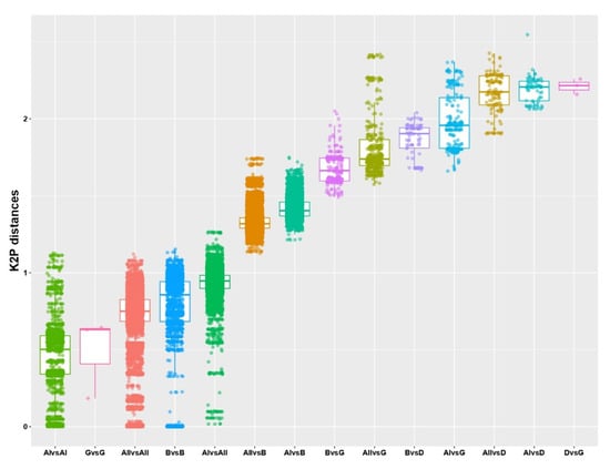 The results showed that the median of the genetic distances within each genus (including comparison between group I and group II alphabaculoviruses) was less than 1, while they were significantly higher than this value when the comparison between genera was made. This reinforces what was observed in the phylogenetic inference (Figure 7) and when the protein-coding genome with common ancestry was studied (Figure 3), showing that the taxa used to classify baculoviruses were adequate and responded to their evolutionary history, with the unique deltabaculovirus being the most distant representative of Baculoviridae.