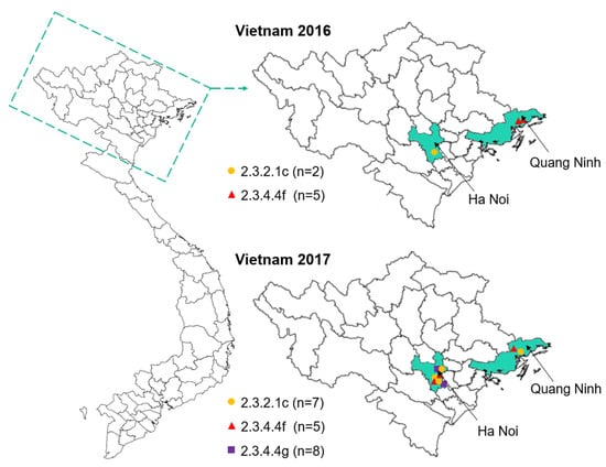 Geographic locations of surveillance activities in Vietnamese live bird markets from 2016 to 2017. Left, map of Vietnam with province borders. Right, magnification showing the northern part of Vietnam. The provinces where the samples were isolated are shown in aquamarine. The virus clades are indicated with different symbols; the number of isolates is listed in parentheses. The symbols in the map indicate the different locations at which viruses were collected.