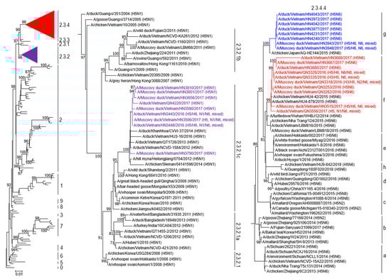 Phylogenetic analysis showing the HA genes of highly pathogenic avian H5N1 and H5N6 influenza viruses isolated in Vietnam from 2016 to 2017. Left panel: The phylogenetic tree of HA genes was rooted to A/goose/Guangdong/1/1996 (H5N1). Viruses of clades 2.3.2 and 2.3.4 were collapsed and are indicated by purple and red triangles, respectively. Details are shown in the center and right panels. The viruses sequenced in this study are marked in purple (clade 2.3.2.1c) or red and blue (clade 2.3.4.4). Center panel: Clade 2.3.2.1c viruses isolated in this study are shown in purple. Bootstrap values greater than 80% are indicated at the nodes. Right panel: Clade 2.3.4.4f and 2.3.4.4g viruses isolated in this study are shown in red or blue, respectively. Bootstrap values above 80% are indicated at the nodes.