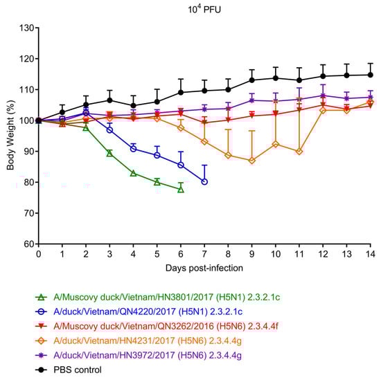 Six-week-old female BALB/c mice (Jackson Laboratory, Bar Harbor, ME, USA) were anesthetized with isoflurane and inoculated intranasally with 104 plaque-forming units (PFU) of each virus in a volume of 50 μL. Control mice were inoculated with 50 μL of PBS. Body weight and mortality were monitored daily for 14 days. Infected mice were euthanized if they lost more than 25% of their initial body weight.