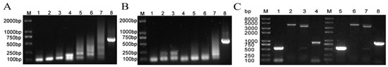 Identification of boIFN–λ3/λ3V18M. (A,B). boIFN–λ3 and boIFN–λ3V18M SOE–PCR, respectively. M: Trans2K DNA Marker; 1~4, 5~6, 7, and 8 indicate the first, second, third, and fourth PCR results, respectively. (C). Enzyme digestion and PCR identification of the P. pastoris transformants integrated into the boIFN–λ3 gene. M. Trans2K PlusII DNA Marker; 1 and 5. PCR result based on P1/P14; 2 and 6. Xho I digested; 3 and 7 Xho I and Xba I digested; 4 and 8. PCR result based on 5′AOX/P14. 1~4 was the result of recombinant expression vector pPICZαA–boIFN–λ3 and 5~8 indicated the pPICZαA–boIFN–λ3V18M.