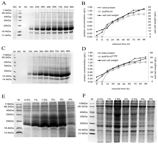 Optimization of the expression conditions of the recombinant boIFN–λ3/λ3V18M. (A,C) The SDS–PAGE analysis of different induction times of the recombinant boIFN–λ3 and boIFN–λ3V18M, respectively. (B,D). The protein weight analysis of different induction times of recombinant boIFN–λ3 and boIFN–λ3V18M, respectively. (E,F). SDS–PAGE analysis of recombinant P. pastoris GS115 under different methanol concentrations. (E). GS115–pPICZαA–boIFN–λ3. (F). GS115–pPICZαA–boIFN–λ3V18M. M. Unstained protein molecular weight Marker; NC. The induced protein of GS115–pPICZαA.