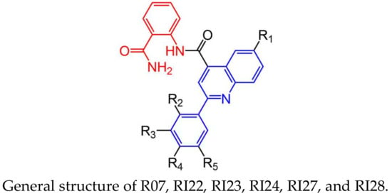 Phenylquinoline and aminobenzamide-containing compounds showed high affinity to ZIKV NS2B-NS3 in proteolytic activity assays. This prompted us to search for more inhibitors from the same chemical class that are commercially available. We found five compounds from the available vendor with structures related to RI07, including the presence of aminobenzamide and phenylquinoline with varied substituents. These compounds, labeled as RI22, RI23, RI24, RI27, and RI28, were tested for their inhibition activity in the enzymatic assay. The structures of RI07 and its derivatives can be found in Figure 3.