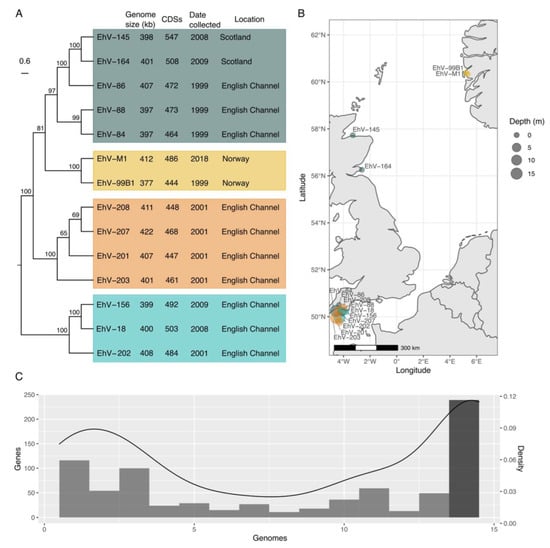- Fromm, A.; Schatz, D.; Ben-Dor, S.; Feldmesser, E.; Vardi, A. Complete Genome Sequence of Emiliania Huxleyi Virus Strain M1, Isolated from an Induced E. Huxleyi Bloom in Bergen, Norway. Microbiol. Resour. Announc. 2022, 11, e0007122. [Google Scholar] [CrossRef] [PubMed]
