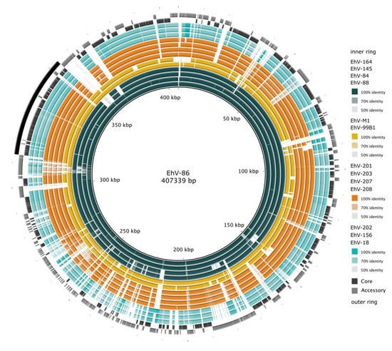 - Nissimov, J.I.; Worthy, C.A.; Rooks, P.; Napier, J.A.; Kimmance, S.A.; Henn, M.R.; Ogata, H.; Allen, M.J. Draft Genome Sequence of the Coccolithovirus EhV-84. Stand Genom. Sci. 2011, 5, 1–11. [Google Scholar] [CrossRef]