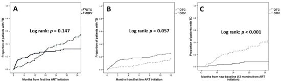 However, higher rates of TD were observed for dolutegravir in the first 12 months of treatment; the estimated TD was 25.5% with dolutegravir versus 17.6% with darunavir at 12 months (log rank p = 0.057), when follow-up was censored at one year. Conversely, higher rates of TD were observed for darunavir after the first 12 months of treatment; the estimated TD was 9.1% with dolutegravir versus 40.6% with darunavir at 36 months (log rank p < 0.001), when only patients still on first-line treatment after 12 months were considered.