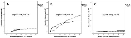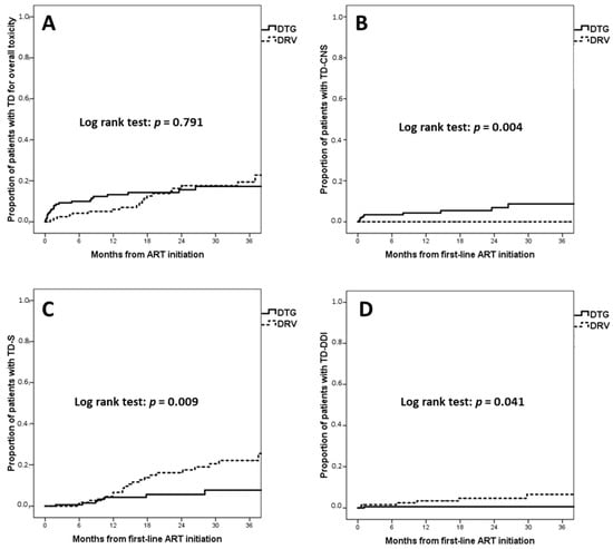 No significant differences were observed between dolutegravir and darunavir regarding the incidence of TD for overall toxicity (dolutegravir 18.2 per 100 PYFU versus darunavir 21.5 per 100 PYFU; the estimated proportion of TD for toxicity at 36 months was 17.3% for dolutegravir and 19.4% for darunavir, log rank p = 0.791) (Figure 2A).